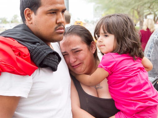 Tanya Ehrig, 27, with her child Trinity, cries for the victims of the Mesa shooting on March 18, 2015. Ehrig's sister, Veronica, was one the girlfriend...